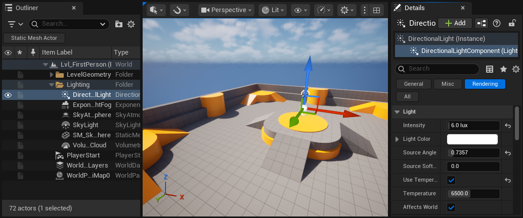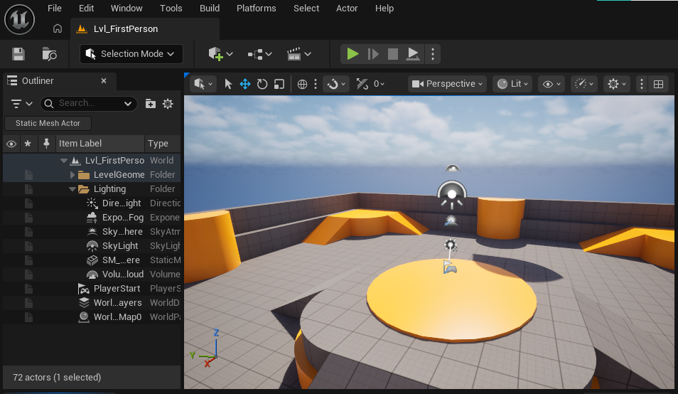 Levels are Unreal Engines version of Scenes, and they function mostly the same as their Unity counterpart: Objects in the level are listed in the outliner, objects can be selected to see details, and there is a play button at the top to test the currently active level. One small but noticeable difference is that you cannot disable objects or components with the UI in Unreal Engine, which can make testing a little trickier. Another difference is that in Unity it would be common to make smaller sections of a scene into prefabs to be loaded in, but in UnrealEngine making another level and loading it into the main level is the more common approach (but both engines do support either option).