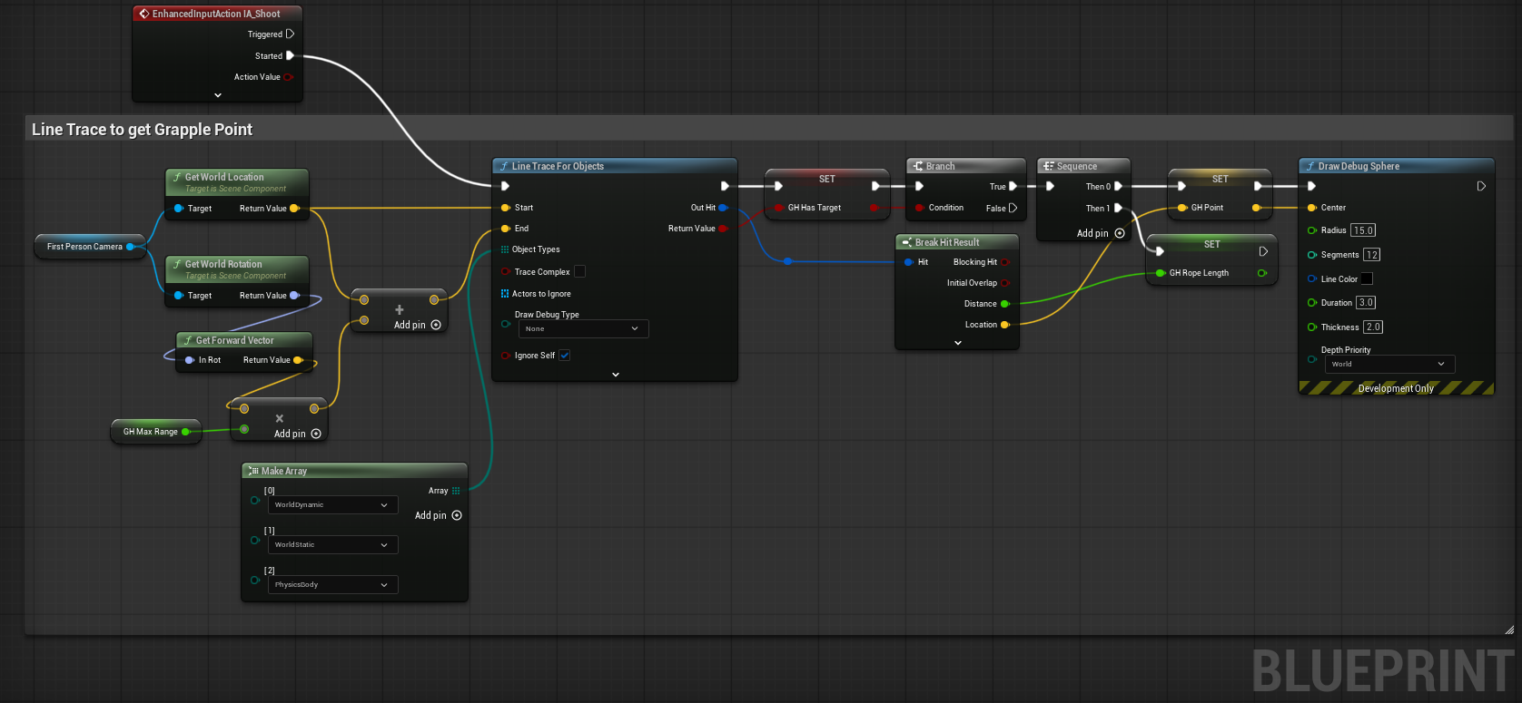 - From the 'True' line of the branch, break the 'Out Hit' pin and use the 'Location' pin to save the grappling hook point in a variable (e.g. 'Grapple Point').